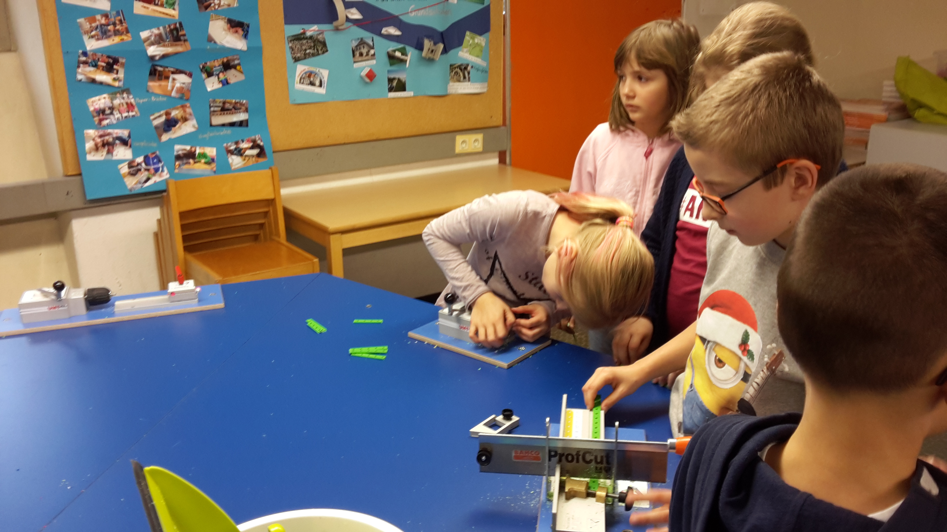 Zu Beginn der AG Mitte Oktober lernten die Kinder zu allererst die Materialien namentlich kennen. Als zweiten Schritt hatten die Kinder die Möglichkeit die Vorrichtungen zu testen. Es wurde gefräst, gebohrt und gesägt.