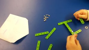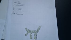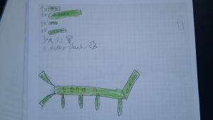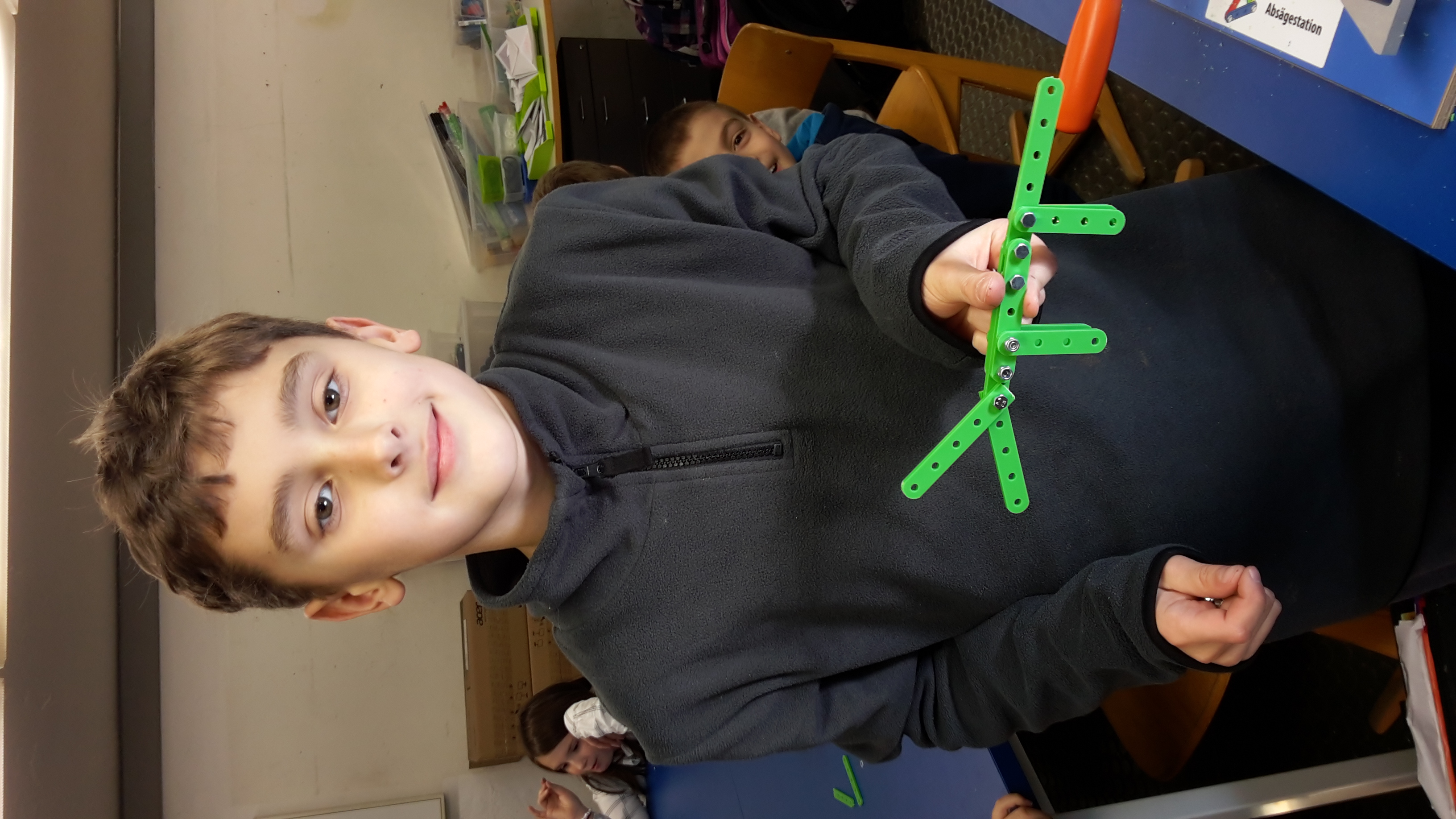 In einem ersten Schritt fertigten die Kinder Zeichnungen und Skizzen an. Im Werkraum stellten sie ihre Zeichnungen den anderen Kindern vor. Ein reger Austausch entstand. In der Gruppe entwickelten sie aus den 14 verschiedenen Ideen eine Art „Prototyp“ für die Größe der Schrauben und für die Länge der Vierkantstäbe.