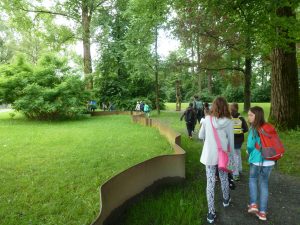 Nach der Führung im Museum besuchten wir das Freigelände am Inn. Wir liefen ein Stück am Inn entlang und erkundeten die Fließrichtung des Inns und gingen am Modell die Städte ab, durch die der Inn fließt. Das Modell bildet ein Metallband, welches maßstäblich den Innverlauf nachbildet und an welchem mächtige Gesteinsbrocken auf die wichtigsten geologischen Formationen hinweisen, die der Inn auf seinem Weg vom Maloja bis Passau tangiert. Von der Schweiz bis nach Passau. Dort mündet der Inn nämlich in die Donau.